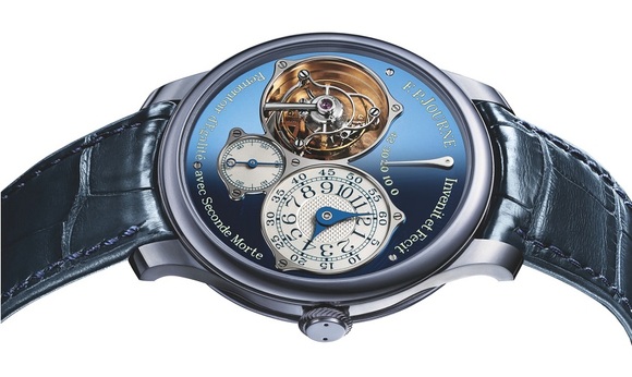 贵金属圈外,一些稀有金属也因其稀有特质被采用制作表壳表链。F.P. Journe为2015年Only Watch慈善拍卖制作的表款展现出不同光芒——这只陀飞轮腕表表壳使用钽金,呈现幽兰色金属色泽,搭配铬蓝色表盘和18K玫瑰金透底机芯,配色大胆前卫,看起来非常漂亮。