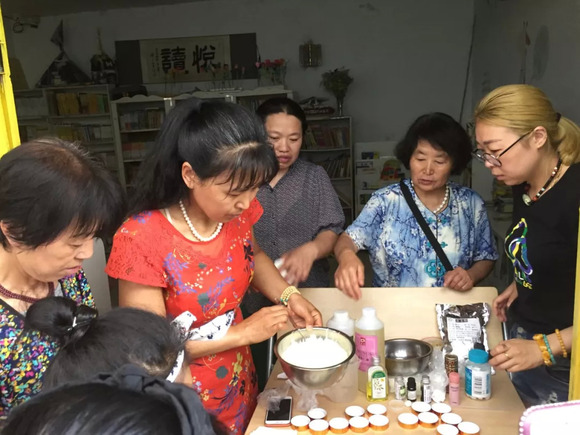 △靓阿姨在北京流动人口社区面向社区妈妈推广环保手工润唇膏和防晒霜