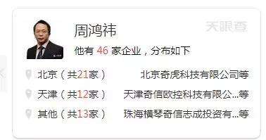 天眼查数据显示,周鸿祎名下共46家公司。其中,包括奇虎科技在内的21家公司注册在北京,包括三六零科技有限公司在内的12家公司注册在天津,另外有13家注册在上海、苏州、珠海等城市。