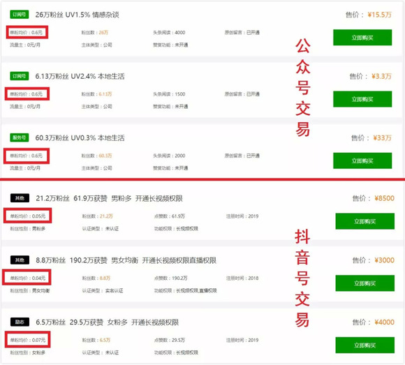 同一交易平台上公众号和抖音号的粉丝单价差别
