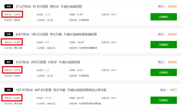 “公众号一个粉丝能卖将近一块,最高有五块,但一般情况下抖音号一个粉丝不会超过一角钱,卖一个100万粉的公众号和100万粉的抖音号,这之间的利润差距非常大。”某业内人士表示。