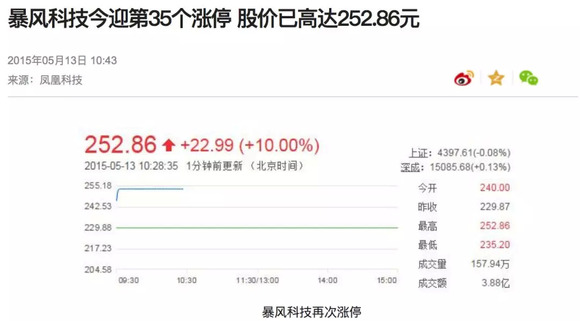 而这之后,暴风所经历的事情,后来被很多人都津津乐道:上市 40 天,36 个涨停板,股价从 7 块多飙到 300 多块。
