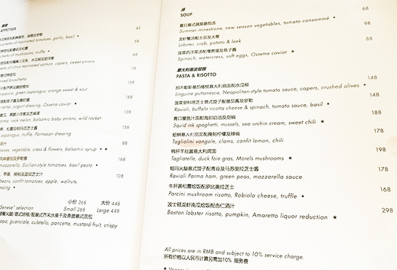 两道甜点从口感而言并没有给人留以深刻印象。晚市菜单标出的价格,以其在上海IAPM的地理位置和名牌名号而言也不能算贵。虽然菜单上标记着10%的服务费,但截至于7月25日,餐厅还未开始施行。