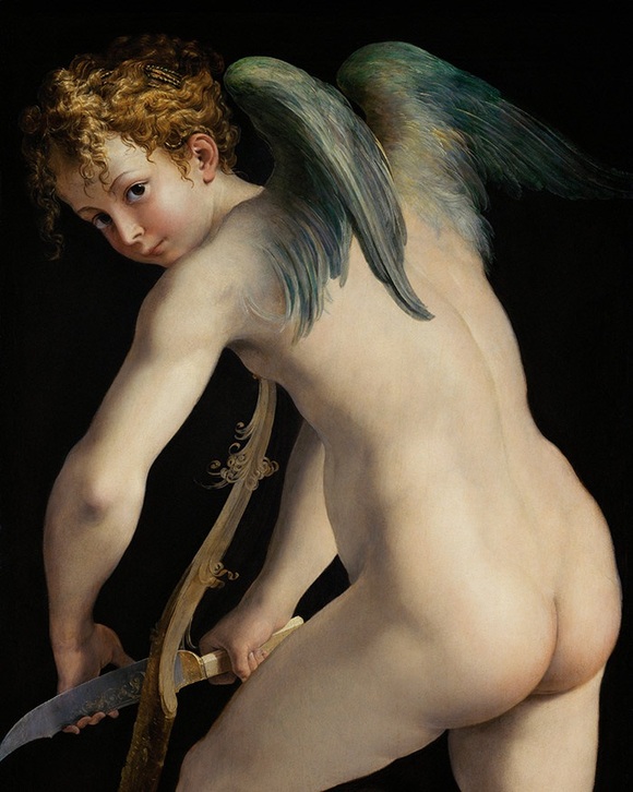 这个姿势灵感来源于古罗马人钟意的一种“淫乱行径”,但彼时有位罗马艺术家却大张旗鼓将其表现出来。此人正是阿尔蒂诺,他为《姿势》中每幅版画配写了十四行诗,并想象图中男人大喊:“丘比特,你这小混蛋,别再拉车了!”这“淫荡”绘本后来启发出最令人神迷的文艺复兴极盛时期作品之一:帕米贾尼诺的《削弓的爱神》(见图七)。帕米贾尼诺的爱神回首锁定我们的目光,隐含的仍是那个问题:你看出什么了?你喜欢你所看到的吗?