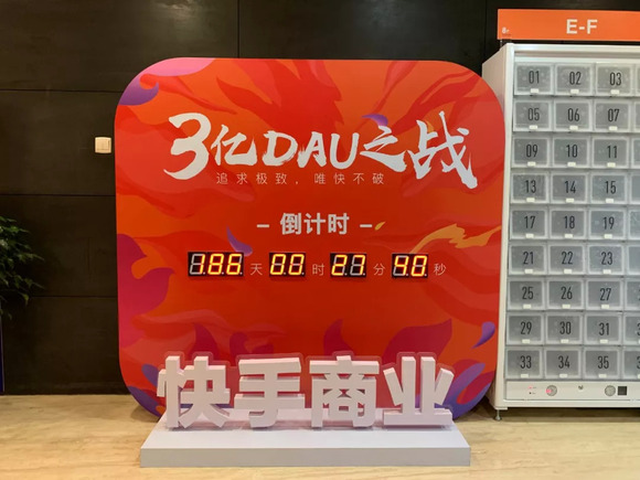 从E座大楼的一个电梯口出来,能看到各种橙色宣传海报张贴在墙上每一个角落,一个K3目标倒计时大屏摆放在过道最显眼处。这是快手公司里,唯一一个张贴冲刺海报的、做倒计时大屏的部门。