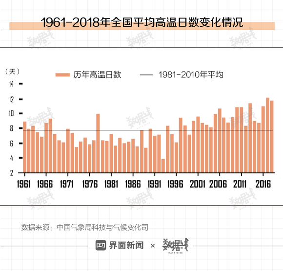 据中国气象局科技与气候变化司数据,1961年以来,全国平均高温日(即不低于35℃)数量整体呈上升趋势。2018年,全国平均高温日共计11.8天,在历史上仅次于2017年。