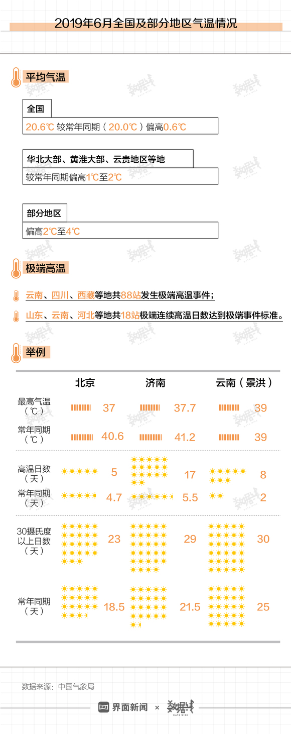据中国气象局数据,2019年6月,全国平均气温为20.6℃,较常年同期(20.0℃)偏高0.6℃,部分地区偏高2℃至4℃。