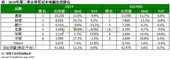 根据全球市场研究机构集邦咨询最新笔记本电脑出货报告显示,2019年第二季原本因为对中美贸易摩擦与Intel CPU缺货问题的担忧,导致整体市场展望趋于保守。