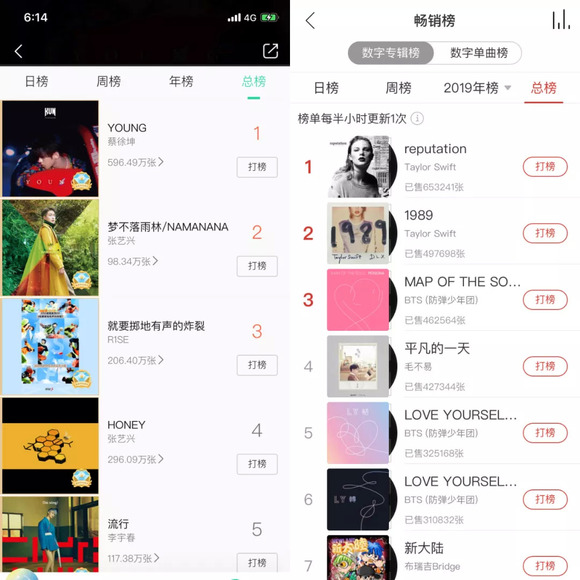 QQ音乐专辑畅销总榜(左)和网易云音乐专辑畅销总榜(右)。图片来源:QQ音乐、网易云音乐截图