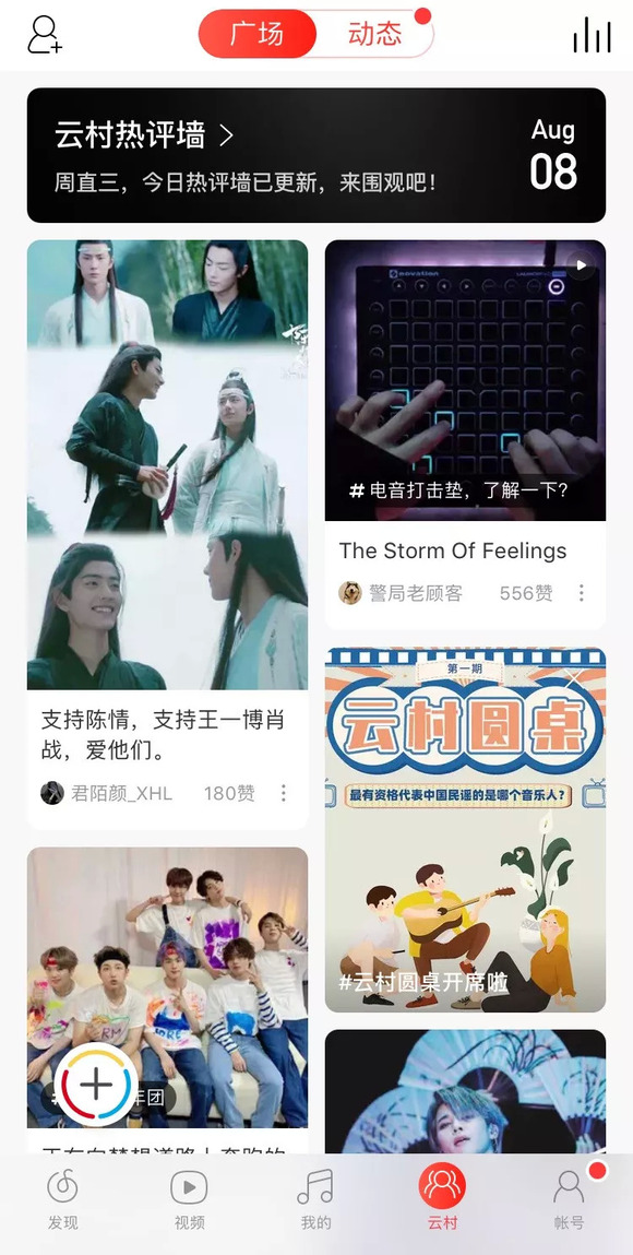 在新版本的网易云音乐中,底端的“朋友”tab栏已经变成了“云村”。打开云村板块,除了有之前的“动态”页面,还新增了一个“广场”功能。