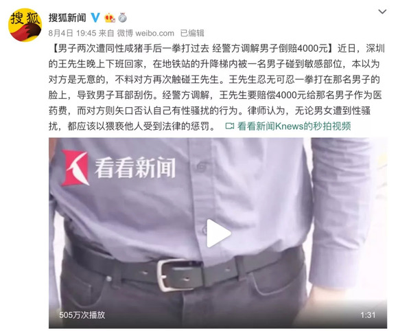 8月4日,据@环球时报 报道,深圳的王先生在地铁站中遭遇了同性“咸猪手”。