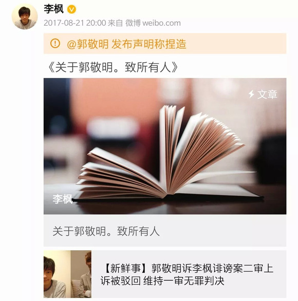 △最世文化旗下作者李枫发文指控郭敬明对其性骚扰及性侵。图/微博