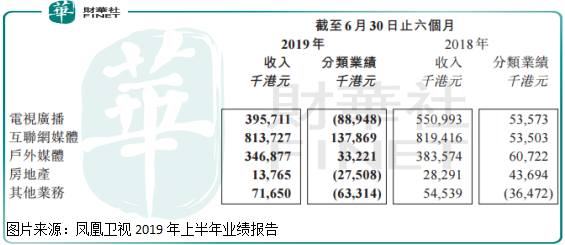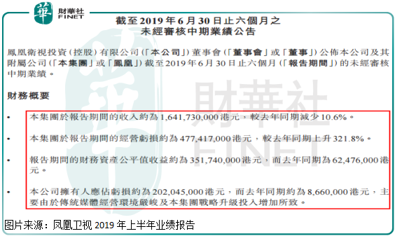 具体看,凤凰卫视2019年上半年实现营业总收入约为14.6亿元(人民币,下同),同比减少10.6%;经营亏损约为4.2亿元,较去年同期上升321.8%,股东持有人应占亏损约为1.8亿元,去年同期亏损约为0.07亿元。