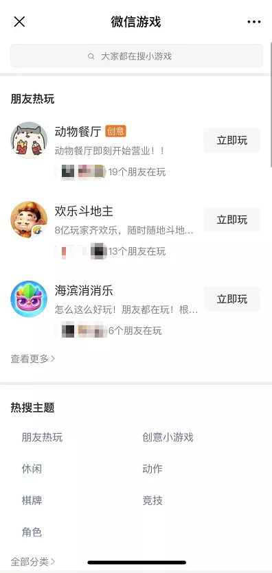 相信很多游戏从业者都已经发现,近期微信对“游戏中心”进行了改版内测,其中小游戏的展示发生了一定变化。由“朋友热玩”和“热搜主题”两大模块构成了微信小游戏中心的核心内容,而“热搜”栏目中又以朋友热玩、创意小游戏、休闲、动作、棋牌、竞技、角色,七大类别组成,每一类别单独展示。如此一来,微信小游戏中心的展示就更加清晰明了。