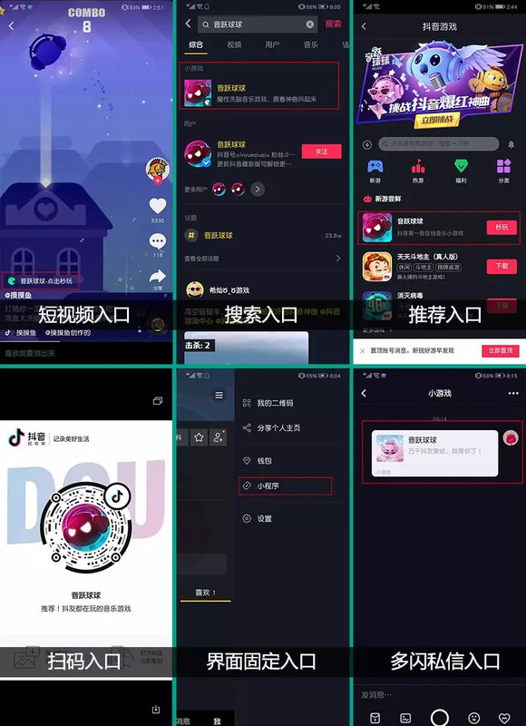 而除了通过搜索打开游戏中心之外,抖音还为“小游戏”设置了5大入口,包括短视频广告入口、推荐入口、扫码入口、小程序界面固定入口、多闪私信入口。虽然目前这些入口的使用频率还不太高,但却不难看出抖音对小游戏的扶持和决心。