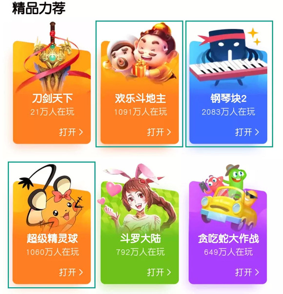 进入QQ小游戏中心页面中最显眼的部分莫过于这个6个以卡片形式进行展示的“精品力荐”,上面还附带有玩家的在玩数据,显示最多的一个《钢琴块2》在玩人数超过了2000万,另外《欢乐斗地主》以及《超级精灵球》两款游戏的也有破千万的在玩人数。
