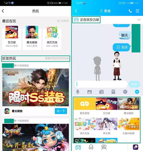进入QQ厘米秀游戏中心通过“最近在玩(自己)→好友热玩(好友)→大家在玩(陌生人)”三个不同梯度的推荐设置对应玩家不同层面的社交需求;而且玩家正在游玩的游戏将会显示在对话框顶部,通过点击顶部的即可进入一同游戏。对于习惯“扩列”和“连麦”的年轻用户,这种交互设计显得更加亲切而实用。