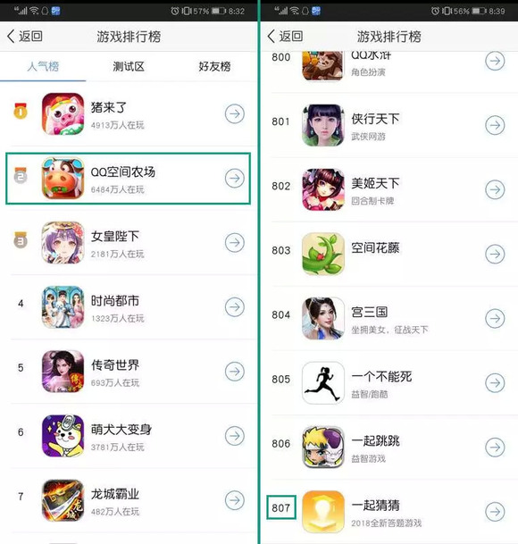 在另一方面,最新版本的QQ空间页面布局要比QQ小游戏中心简化了不少,而且推荐的游戏数量也有明显的减少。在测试区排行榜只显示了前三位的游戏,点击“更多”进入详细的排名榜页面后会有“人气榜”“测试榜”以及“好友榜”三个不同的榜单。值得一提的是,QQ空间不仅在热门榜单头部出现了在玩人数逼近6500万的《QQ农场》,而且单是“测试榜”上就有807款小游戏!