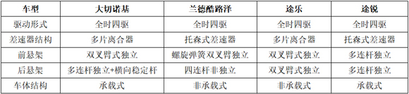 在底盘转向方面,大切诺基、兰德酷路泽、途乐和途锐都是采用全时四驱,大切诺基和途乐配备的多片离合器中央差速器结构,不及兰德酷路泽和途锐的托森式差速器稳定。在车体结构上,只有途乐和兰德酷路泽是纯正的非承载式大梁越野底盘,而大切诺基和途锐是承载式轿车底盘,越野性能略弱,但驾乘舒适性更舒服。