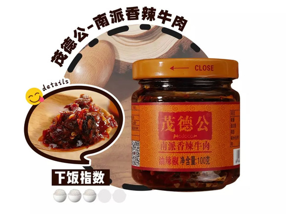 采用皮薄肉厚的亚热带鲜椒,搭配真材实料的大块牛肉粒,茂德公尽力保存食材鲜美,不添加过多添加剂,营养健康又香辣可口,有了它多吃一碗饭都没问题