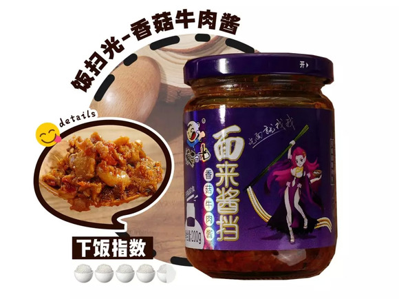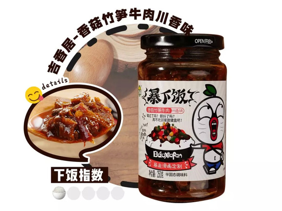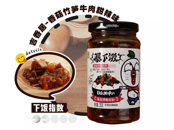 这款拌饭酱是吉香居的暴走漫画定制系列-暴下饭,光是听名字就流口水了。这款甜辣味适合口味喜甜的朋友,里面有牛肉、香菇、豆豉、竹笋、豌豆、榨菜、盐菜7大原料,口味丰富、干香有嚼劲