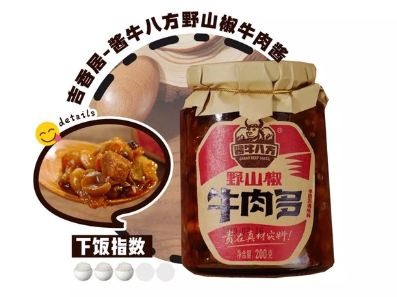 这款遵从了吉香居的吉味3调:闻之鲜香、色泽鲜亮、入辣完整。不论是配还是配面都是一个好选择,野山椒融合牛肉的鲜美滋味,让人吃一口就停不下来