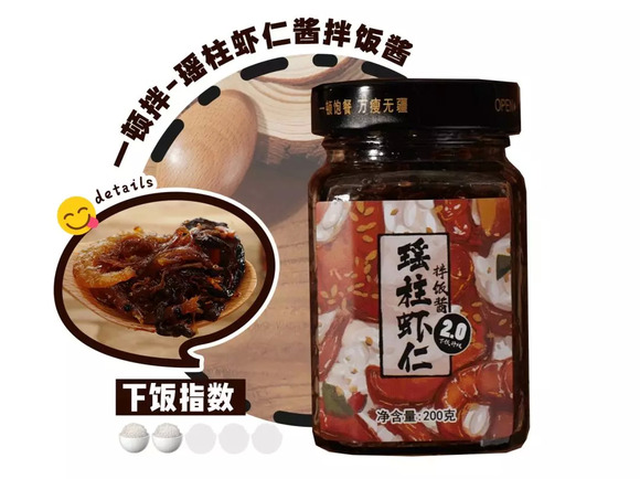 这款打着一瓶酱就是一盘菜肴的口号,每一勺都有大虾的鲜美拌饭酱,配料来自潮汕的海货,不仅美味还营养。它的拌法也多到让人害怕,让外卖不再孤独,让懒人享受美味
