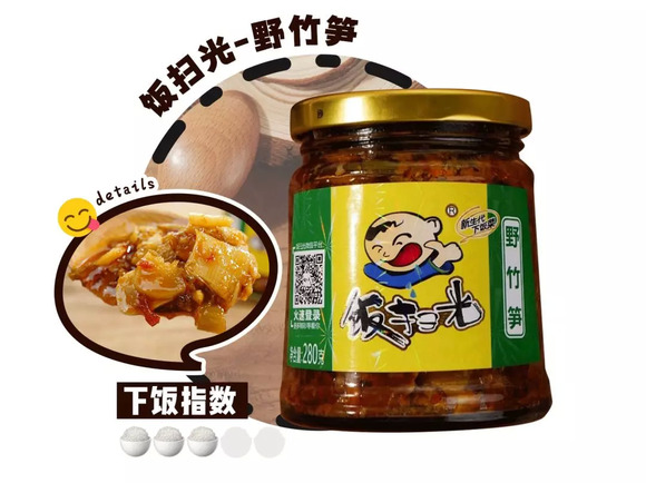 饭扫光这款野竹笋拌饭酱香辣爽脆都有了,笋是真的爽脆,酱是真的香辣。它的原料来自于绿色生产基地,主料为无公害的蔬菜和野生原料,是非常放心的一款拌饭酱了