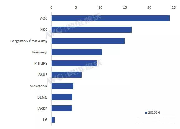 根据前文提到的奥维睿沃数据,具体来看,在国内市场中,AOC优势明显。在2019上半年,其电竞显示器出货量达24万台,位列第一,其在32英寸份额增长明显;排在第二的是HKC,上半年出货量达16万台;排在3-5位的厂商分别是Forgame&Titan Army、三星和飞利浦,出货量分别为15万台、11万台和9万台。