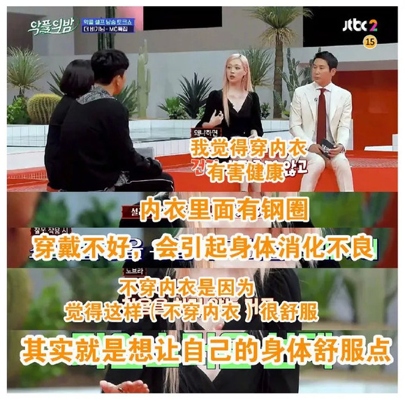 巧的是,最近她在节目中回应了不穿内衣的原因。直言是因为觉得穿内衣有害健康,想让身体舒服点。
