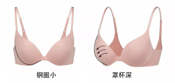纺锤胸要选择小钢圈的深杯bra:钢圈小才能更贴合纺锤胸的下缘,也只有深杯才有能力把胸部全装进去。底径小的纺锤胸如果用了大钢圈,会让胸部失去承托效果。