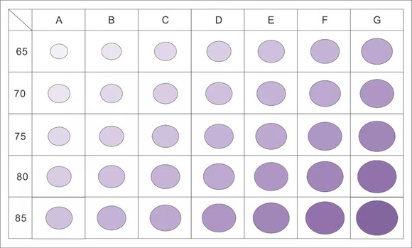 下胸围相同时,罩杯越大,胸部越大:比如70C>70A;