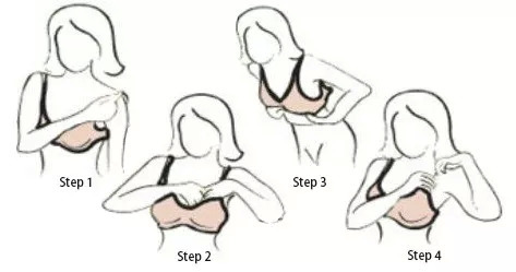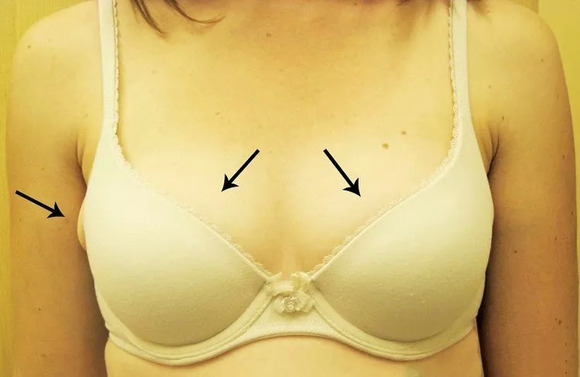 Step 2:保持前倾状态,手掌伸到内衣里面,由腋下往前拨,顺着钢圈,拨到鸡心处;
