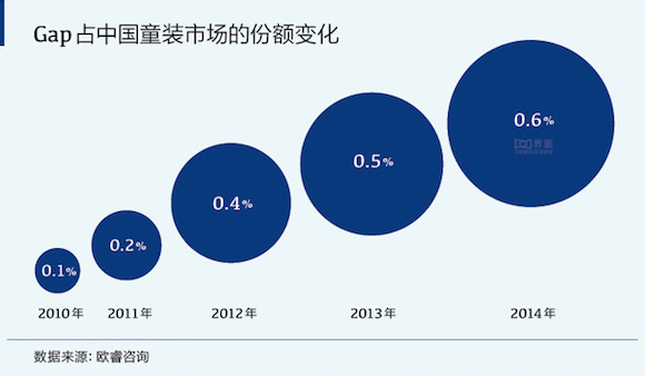欧睿咨询2015年发布的《中国童装市场报告》显示,Gap在中国童装市场份额已从2010年的0.1%上升到2014年的0.6%,2014年市场份额排名第七,也是唯一一个进入中国童装市场前10名的外国快时尚品牌。