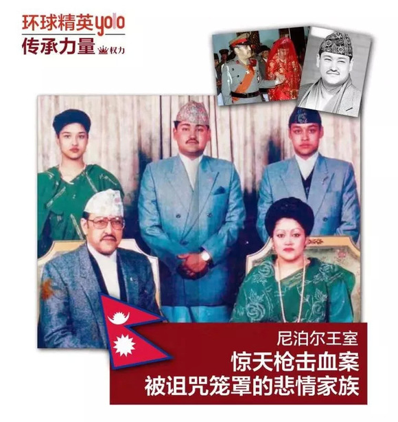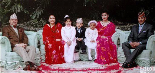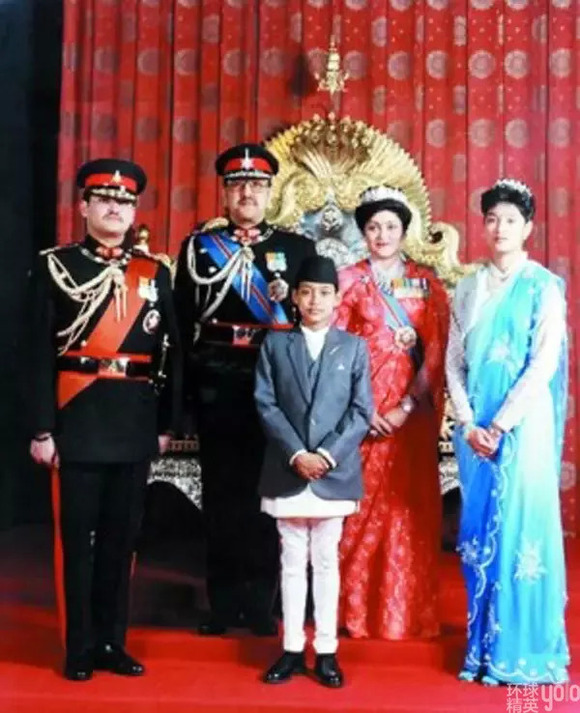 贾南德拉国王(左一)与儿子帕拉斯王储(右一)全家