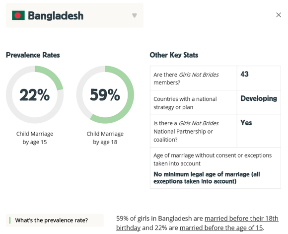 反对女孩童婚的著名援助组织“女孩不是新娘”(Girls Not Brides)的数据显示,孟加拉国的童婚率在世界上排名第四。有59%的女孩在18岁之前结婚,22%的女孩在15岁之前结婚。