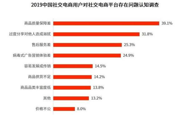 由于社交电商平台的不成熟,社交电商售后服务问题,已经成为业内共同关注的话题。根据艾媒咨询发布的《2019中国社交电商行业研究报告》显示,受访社交电商用户表示目前社交电商平台存在问题主要有商品质量保障差、过度分享对他们造成滋扰、售后服务差,占比分别是39.1%、31.8%、25.3%。