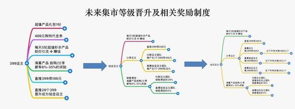 笔者通过跟未来集市店主的沟通了解到,未来集市的“等级制度”清晰明了。分为店主、铂金店主和钻石店主即战略合伙人三个等级。用户缴纳399元购买商品即可成为店主,自此迈入整个的社群体系之中。下图详细介绍了每个等级的晋升条件及活动的奖励。
