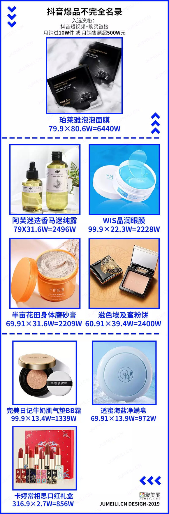 我们把在抖音月销过10w+,或月销售额超过500w的产品称为“抖音爆品”,我们整合抖音官方及聚美丽监测数据、梳理了近期值得关注的美妆单品: