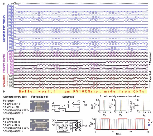 作者将其微处理器命名为“RV16X-NANO”,并在测试中成功执行了一个程序,生成消息:“你好,世界!我是RV16XNano,由碳纳米管制成。”