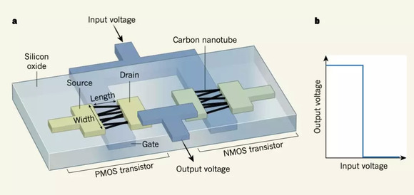 当一个负(或正)电压被施加到一个称为栅极的电极上时,PMOS(或NMOS)晶体管就被接通。该电极控制两个电极(源极和漏极)之间通道的导电性(在本例中通道由碳纳米管组成)。当一个PMOS晶体管和一个NMOS晶体管串联时,结果是一个称为逆变器(inverter)的元件(如下图所示)。如果对这样的逆变器施加低电压,输出电压就会很高,反之亦然。这个元件是Hills及其同事设计的计算机中所有逻辑电路的基本组成部分。