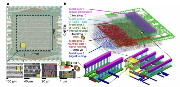 作者表示,他们利用14000多个碳纳米管晶体管制造出一个16位微处理器,证明可以完全由碳纳米管场效应晶体管(CNFET)打造超越硅的微处理器,其设计和制造方法克服了之前与碳纳米管相关的挑战,有望为先进微电子装置中的硅带来一种高效能的替代品。
