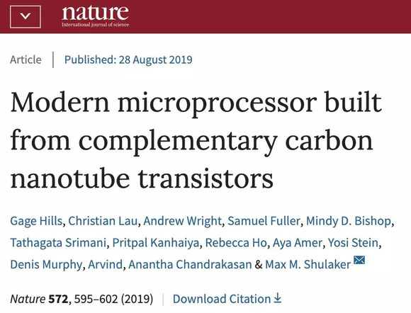 今天,来自MIT的Gage Hills等人今天在Nature发表论文,报告了碳纳米管芯片制造领域的一项重大进展:一个完全由碳纳米晶体管构成的16位微处理器。这是迄今为止用碳纳米管制造的最大的计算机芯片。