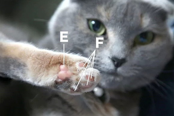 F被称作趾球(digital pad),是喵喵后爪指头上附着的肉球