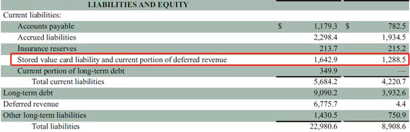 推文:星巴克有约16亿美元的“储值卡负债”('stored value card liabilities'),即星享卡。也就是说该企业负债中的约6%,其实是由咖啡成瘾者借给其供应商的零息贷款。