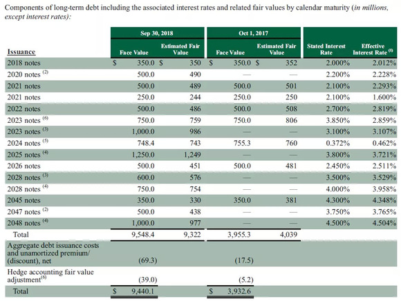 除了向它的顾客借钱,星巴克还会从职业投资者那里借钱。以下是星巴克的长期债务清单: