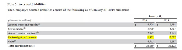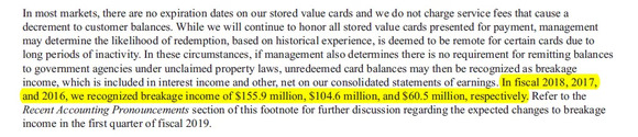 这还没完。我在下面推文中指出,别忘记了损耗 (breakage) 。债券和票据持有人是职业的。他们不会忘记星巴克欠他们的债务。但顾客可没有那么精明。他们粗心、匆忙或者就是健忘,而这意味着大量的礼金卡和余额最终并不会被花掉: