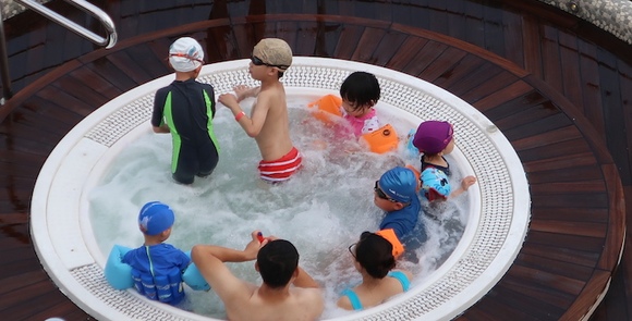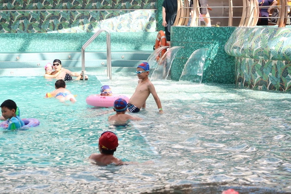 他们在这趟行程里,参与了主题派对快闪和乐高比赛,但最受孩子们喜欢的就是泡在水里。5座亲水泳池是这艘船的一大特点,也给了孩子们充分的理由每座都体验一番,玩水是他们最大的乐趣了。