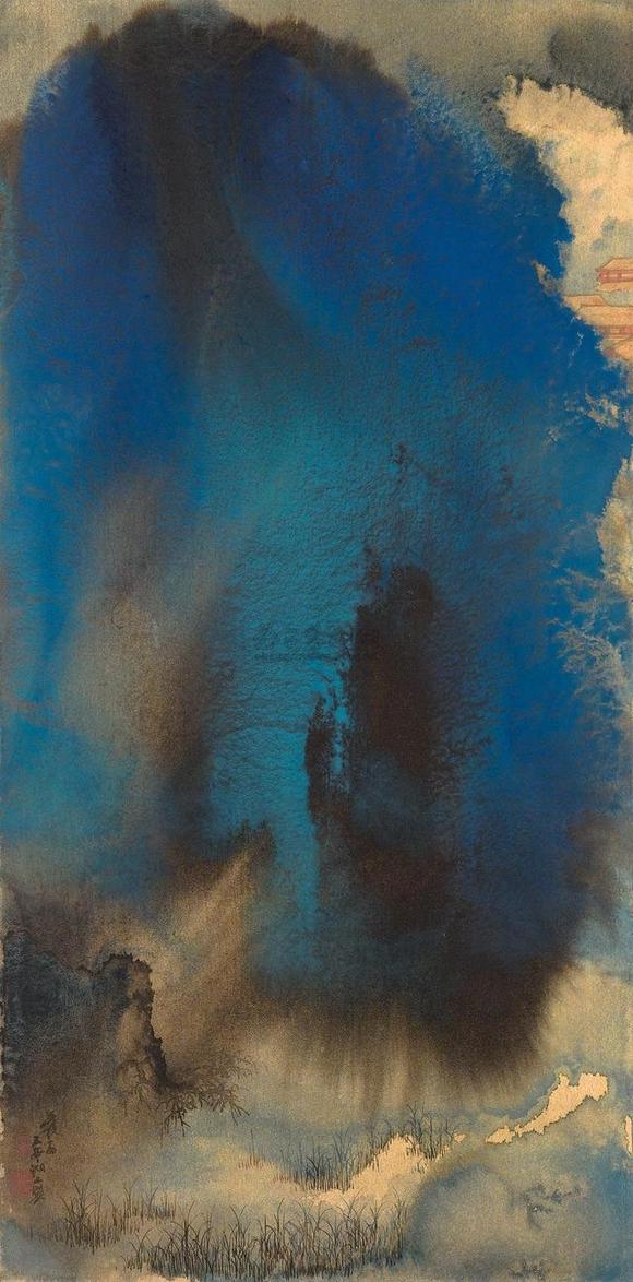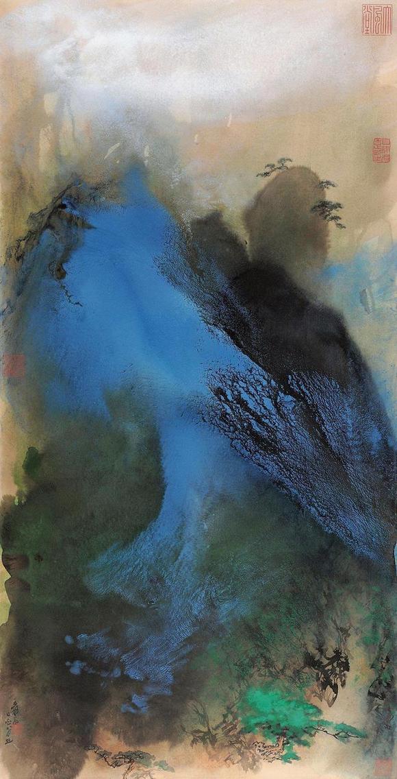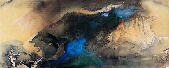 等到墨晕固定后,大千由远处不同角度观看,再细加经营,审度再三,才用传统的笔法在适当位置略加皴法,再点缀人物、屋宇、桥梁、舟楫。于是从混沌中开辟一片山川出来,为此他又增添一方闲章“辟混沌手”,符合并满足他说“艺术家是上帝”的观点。由于每一次泼墨流动的效果绝不会重复相同,因此每一次都是新的创造经验,画面、章法也绝不会有雷同,此与西方自动性技法相通。大千处理画面的方式和他对完成度的要求,端赖他长年养成的传统山水素养,以及他对真山水的阅历,二者相互酝酿而成,仍在中国传统艺术的范围之内。