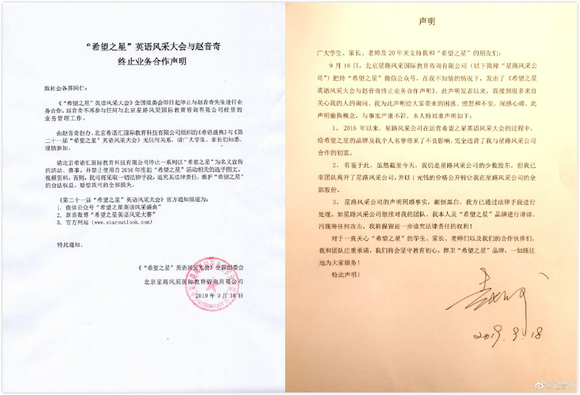 9月18日,希望之星全国组委会、北京星路风采国际教育咨询有限公司(下称“星路风采”)在官网发表声明,称终止与赵音奇的业务合作,由赵音奇创办、北京希语汇国际教育科技有限公司(下称“希语汇”)组织的《希语盛典》与《第二十一届“希望之星”英语风采大会》无任何关系,并要求该公司停止以希望之星为名义宣传的活动赛事,并禁止使用自2016年度起希望之星活动的图文及视频资料。
